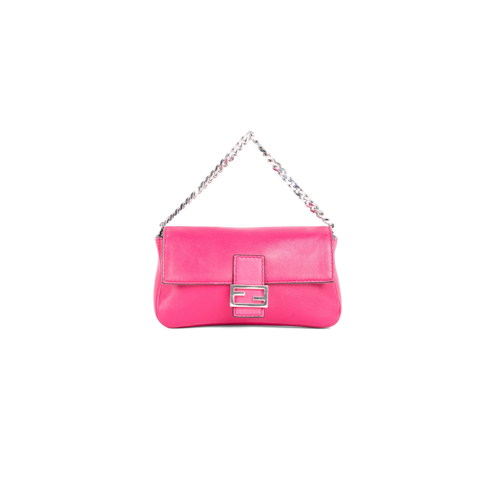 this pink leather micro baguette is in beautiful condition and comes with its cross body strap! The strap is removable, as well as its chain handle. The silver hardware is in great condition.